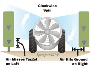 The air angle (or direction relative to the target) is the first concern. Research has shown that low profile radial airblast sprayers without effective straightening vanes or deflectors make the air go up on one side and down on the other. In extreme situations, this might compromise the spray job (e.g. miss the lower portion of the target on one side of the sprayer) or it might simply waste spray and stir up debris. Here’s how you can see if this is happening on your sprayer: