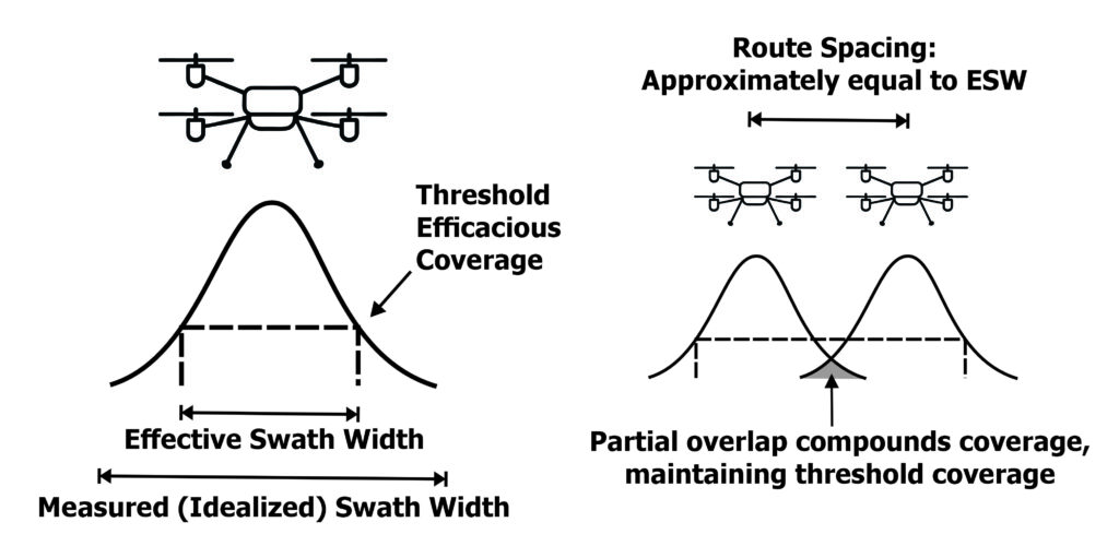 Many drone manufacturers report an idealized swath width that represents the distance between the furthest detectable deposits. However, variability within the swath (that is, the amount of active ingredient deposited, the percent-area covered, and/or density of deposits) implies that the efficacy of the application will also be non-uniform, leading to further considerations.