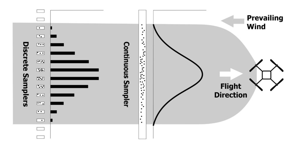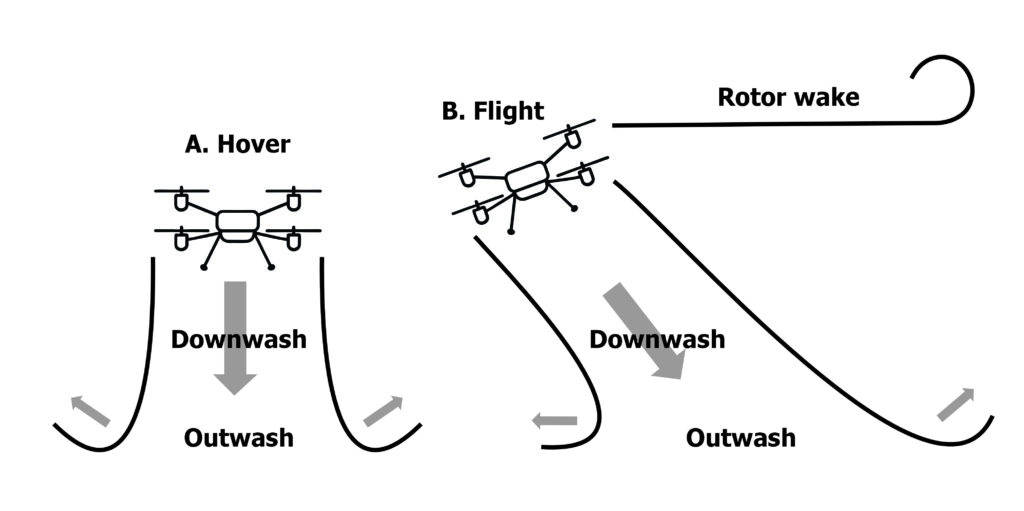 When a rotary-wing drone hovers, each rotor draws air from above and accelerates it downward in a high-velocity blast. The result is a vertical component referred to as the “downwash” and the turbulent splash of air that hits the ground and spreads laterally is the “outwash”. Droplets released beneath a drone at hover are almost completely entrained by the downwash. The majority get driven to the ground and then move laterally along the outwash, while a small portion (likely smaller droplets) recirculate back up through the rotors (see Figure 2a).