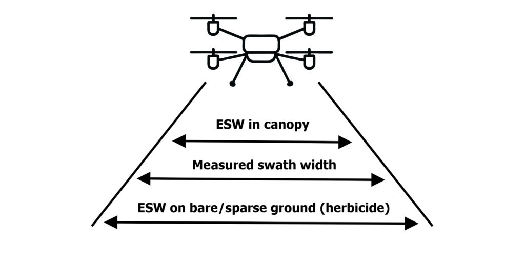 The relatively sparse coverage at the extremes of the measured swath width may be insufficient to elicit the desired biological result. The Effective Swath Width (ESW) represents the segment of the total swath width that results in pesticide efficacy. In some use cases, the two widths can be similar, but in the case of a fungicide application, the ESW is typically only a fraction. The difference is influenced by the “Agronomic Use Case” which includes factors such as: