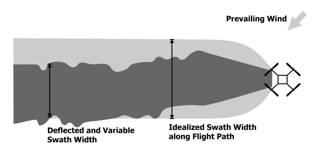 Operational settings, meteorological conditions and the downwash have a cumulative effect on droplet fate. Consider the following operational use case: A rotary-wing drone spraying back and forth over rolling topography will experience changing wind speed and relative direction. The drone will respond by changing drone pitch, rotor speed and pump flow to maintain the desired altitude, travel speed, and application rate. Meanwhile, the drone gets lighter as it sprays, thereby reducing the magnitude of the downwash. Ultimately, this results in a swath width that expands and contracts and may shift back-and-forth or be consistently offset along the flight path (Figure 3).
