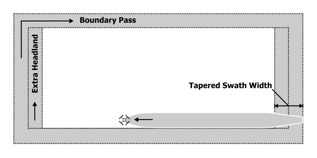 Conventional crewed aerial applications reach the desired speed before spraying the target area. Ideally, rotary-wing drones would do the same, but software limitations currently prevent the separation of flight area from target area. As a result, it can take 25 meters or more for larger drones to accelerate to target speed. Additional headland passes may be required to ensure coverage is not compromised at the beginning and end of flight passes (see Figure 7).