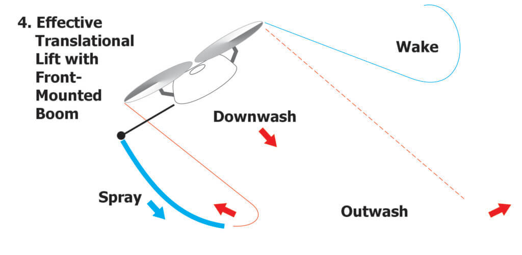 Therefore, consider a horizontal boom positioned along the chord line ahead of the drone. As the drone tips forward during flight, so too would the boom, bringing it closer to the ground and releasing droplets ahead of, and below, the leading edge of the downwash. And, if the droplets were large enough, perhaps most would fall, initially uninfluenced by either the downwash or wake, before being pushed down in a more uniform fashion.