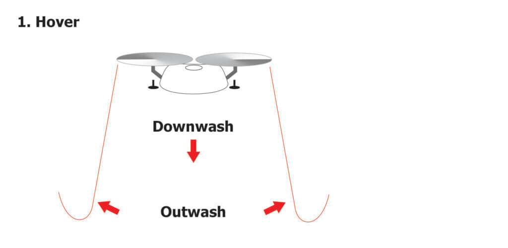 When a drone hovers, each rotor draws air from above and accelerates it downward in a high-velocity blast. The vertical component is called the “downwash” and the turbulent splash of air that hits the ground and spreads laterally is the “outwash”.