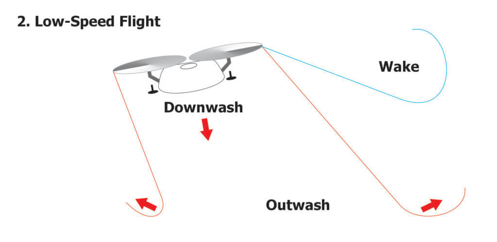 While the downwash is created by lift, “wake turbulence” is created at the tips of the rotors as high-pressure air beneath the rotor wraps around to the low-pressure area above. Given there are multiple rotors, downwashes and wakes interfere with one another. As the drone flies at low speed (~<3 m/s) the merged rotor wake is visualized by the pair of counter-rotating, cylindrical vortices that trail behind.