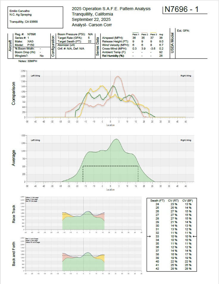 There were multiple flights that day, so we’ll focus on three specific load-outs. The critical parameters are listed in the following table in the order that they flew them. The first load-out (N7696-01) was deemed the best, and was the only one with the boom extended beyond the rotor tips. The other two are included here for interest. N7696-03 attempted to shift the boom back under the drone for cosmetic reasons, but also for ease of transportation. N7696-04 was the same configuration as the last, but with coarser droplets in an attempt to battle the downwash. The fly-in report from N7696-01 is shown below, but all three reports can be downloaded by clicking the links above.