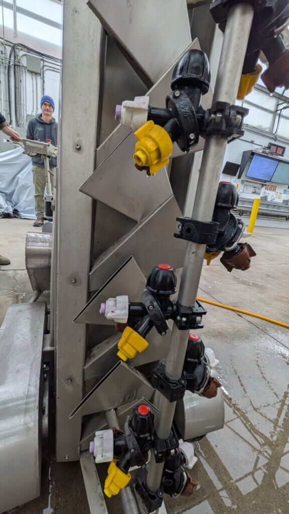 We re-nozzled to my favourite load out: TeeJet TwinJet fans alternating back and forth by 45 degrees from centre. Using 03’s (blue), we saw observed improved uniformity, but still saw misses and suspected we were still using too much water. When leaves are drenched they get heavy, causing them to hang lower and obscure the other parts of the plant. This is the contradiction that limits a strictly hydraulic system: Pressure motivates droplet movement, so you need slightly larger drops and more volume. However, too much water weighs causes run-off and weighs leaves down, obscuring the rest of the canopy. Catch 22.