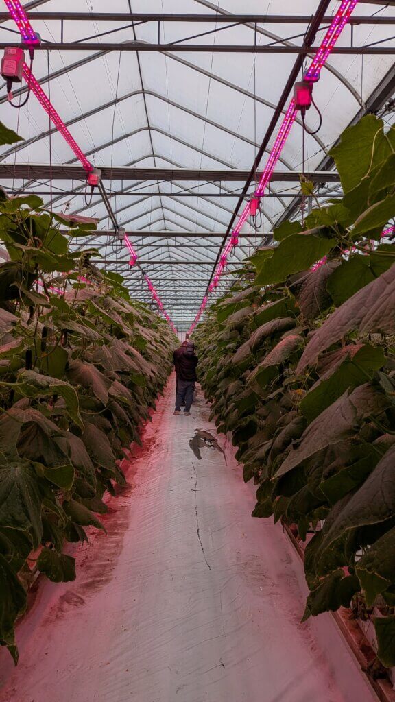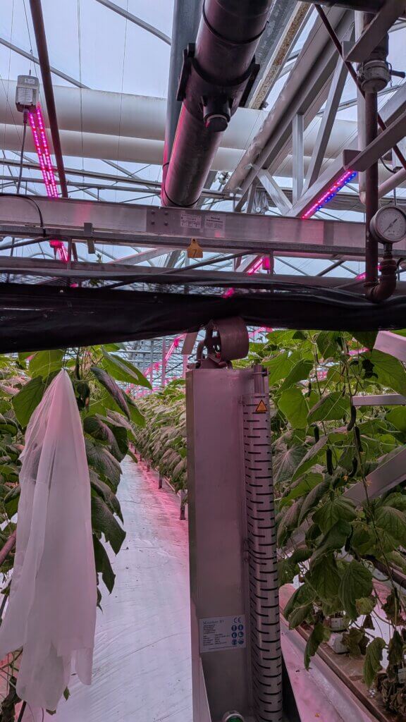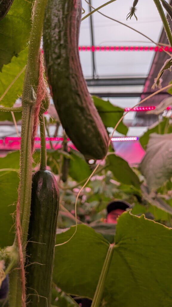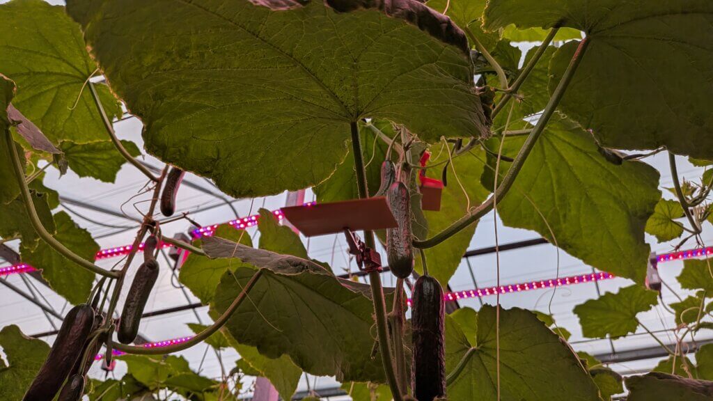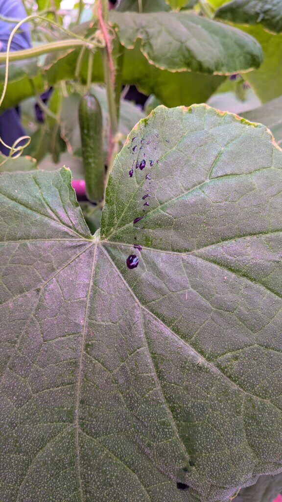We saw the highest nozzle positions were spraying over the canopies and did not need to be on. We also saw drip points form at the tips of the leaves and the bottom of the cucumbers. There was evidence of yellowed (possibly damaged) tissue at the leaf tips, suggesting they were often sprayed to drip. This is wasteful and tends to redistribute deposits in undesirable ways. While it’s hard to avoid on the waxy, vertical cucumbers, it can be prevented on the leaves.