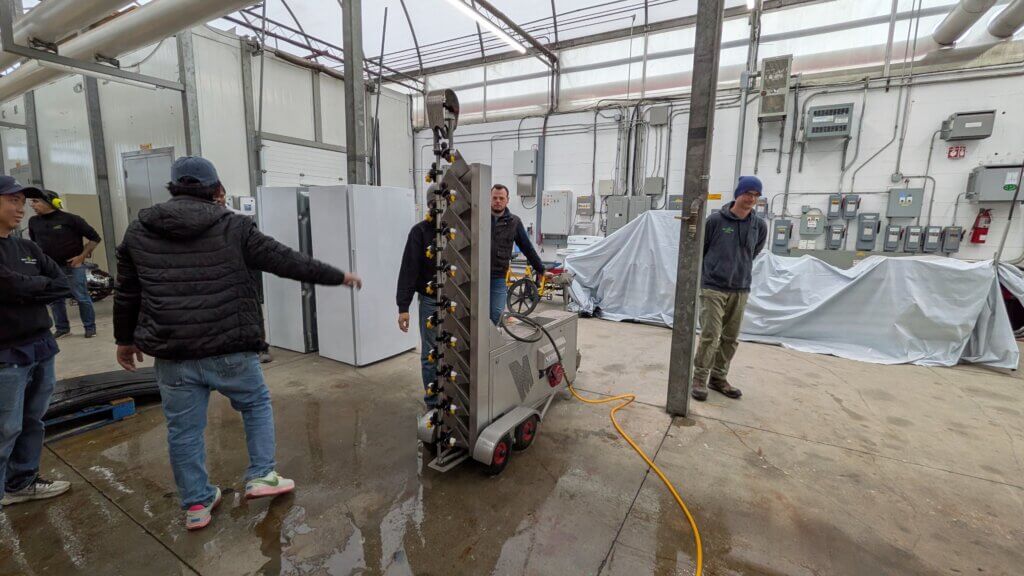 The mast features 18, three-position nozzle turrets (nine to a side). GLG requested a bespoke spring-loaded break-away section at the top of the boom. This allowed the top nozzles to “duck” under an annoying section of greenhouse infrastructure that would have otherwise prevented it from being positioned between the rows.