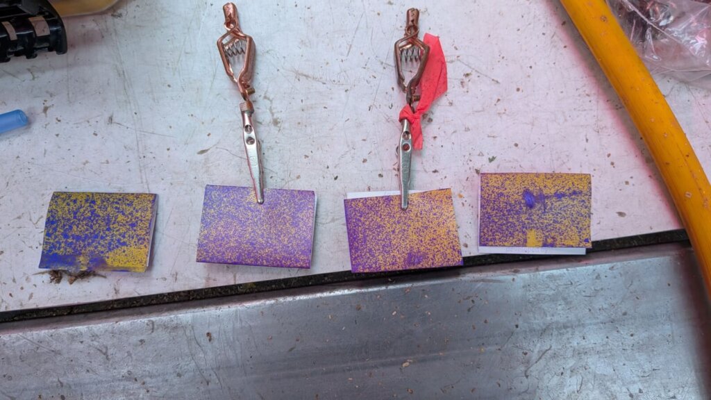 With the subjective part of the assessment complete, it was time to quantify spray coverage. Water sensitive papers were oriented co-planar with the leaves and essentially parallel to the ground. We clipped them 2-3 cm below the leaves by affixing them to the petioles. This way they would move with the leaf and represent a very challenging target (reminiscent of a sucking insect on the abaxial leaf surface).