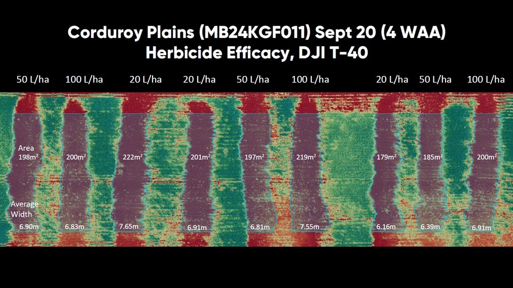 In 2024, Corteva conducted a study entitled “Drone-Delivered Herbicides: Comparing Lontrel XC (Clopyralid) Efficacy Across Application Techniques and Water Volumes”. Their objective was to compare the relative efficacy of hand booms and drones, and to determine if drone efficacy was affected by low water rates. The researchers evaluated the area treated and the effective swath width by manually tracing the burned areas from an aerial NDVI image.