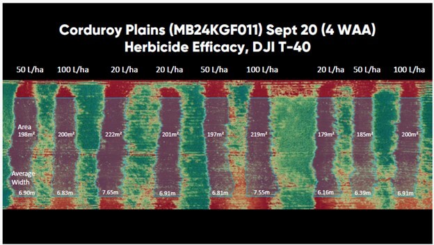 In 2024, Corteva conducted a study entitled “Drone-Delivered Herbicides: Comparing Lontrel XC (Clopyralid) Efficacy Across Application Techniques and Water Volumes”. Their objective was to compare the relative efficacy of hand booms and drones, and to determine if drone efficacy was affected by low water rates. The researchers evaluated the area treated and the effective swath width by manually tracing the burned areas from an aerial NDVI image.