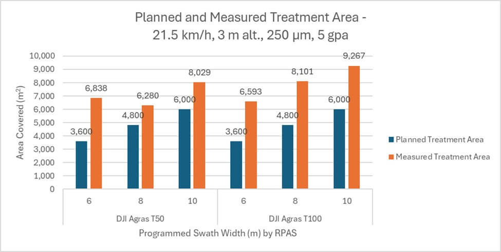 The effect of flight speed on treated area and swath width was examined. In each case, the treated area was significantly larger than the programmed area (Figure 10).