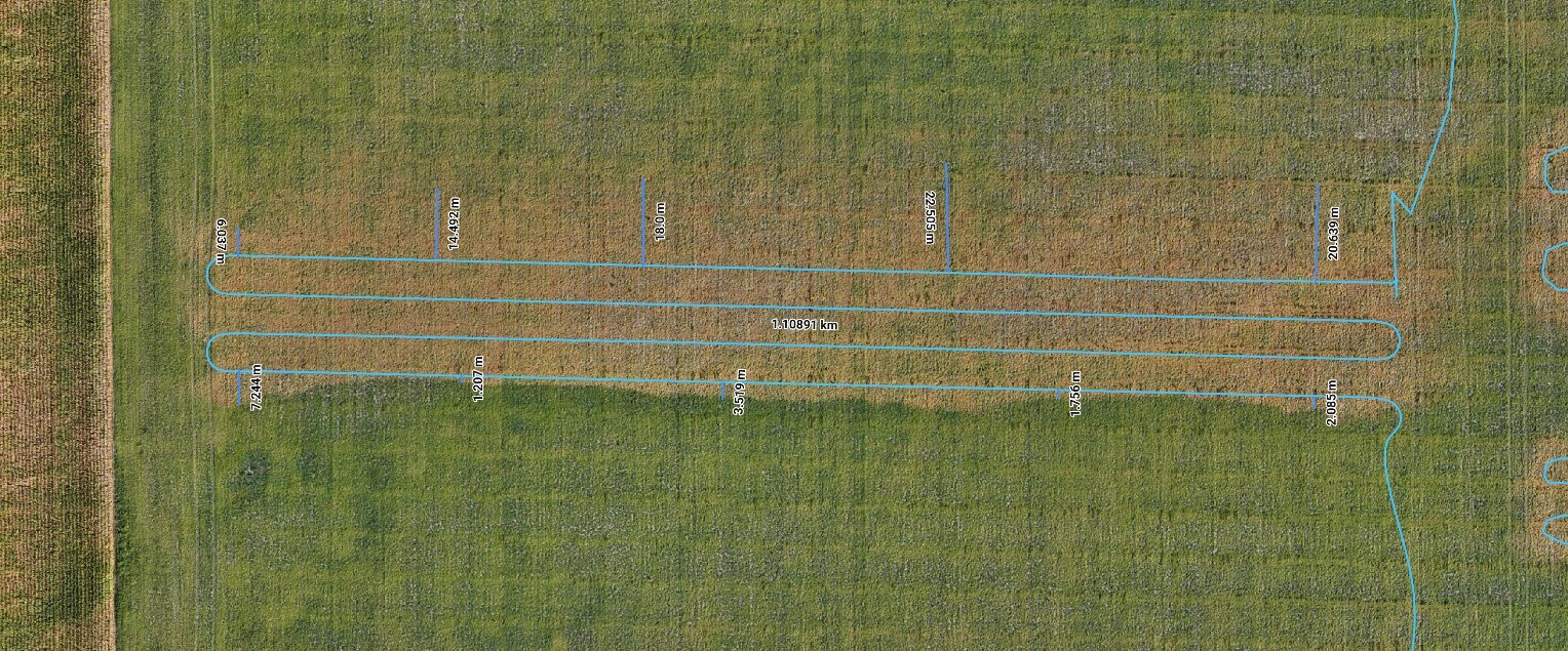 Each flight was centred on the right boundary of the treatment block, as indicated by a pin flag. Four passes were flown per treatment (i.e. two out-and-backs). There were no repetitions for treatments, so there was no need to randomize them.