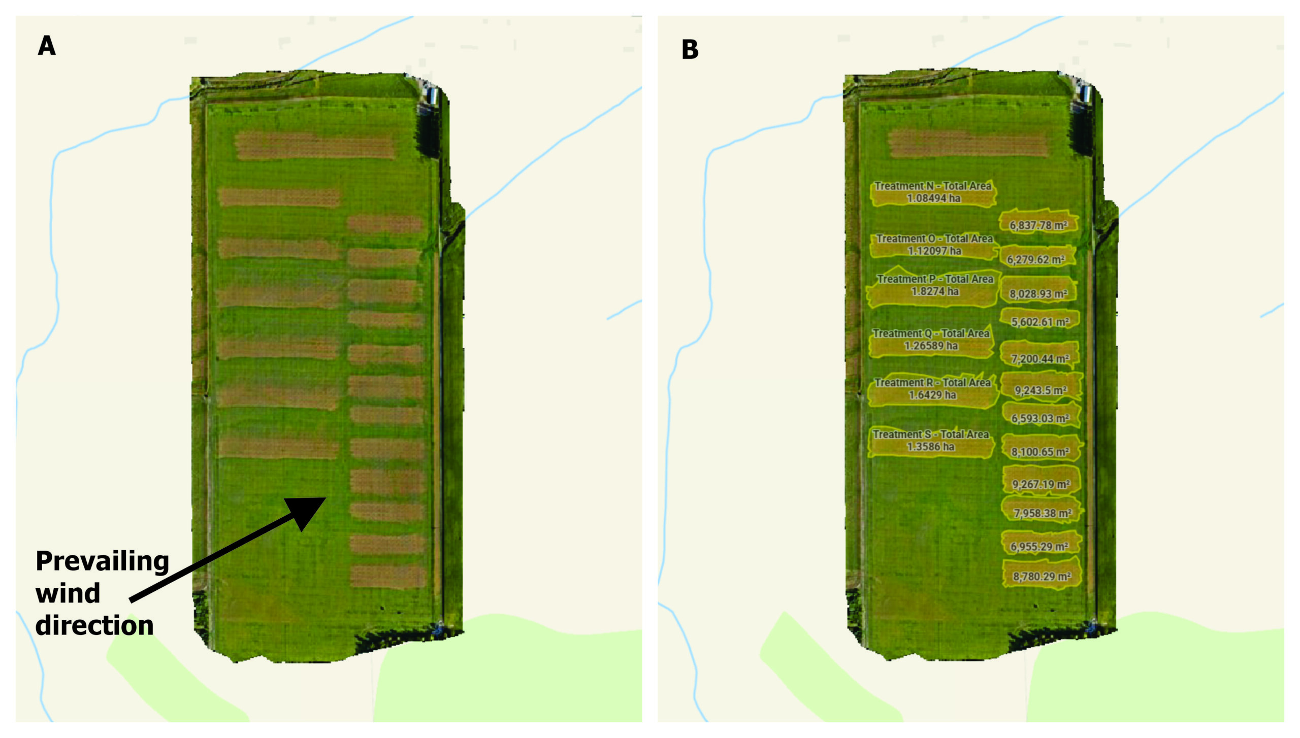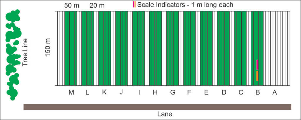 Each treatment block was 150 m long, 50 m wide and a 20 m buffer was maintained between treatments (Figure 2). Two, 1 m scale indicators were placed in Treatment B to confirm scale during image analysis.