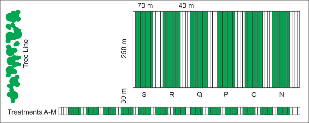 Given the greater potential for displacement and drift in this part of the study, we established wider and longer treatments blocks, and wider buffers between treatments. Each treatment was 250 m long, 70 m wide and a 40 m buffer was maintained between treatments (Figure 3).