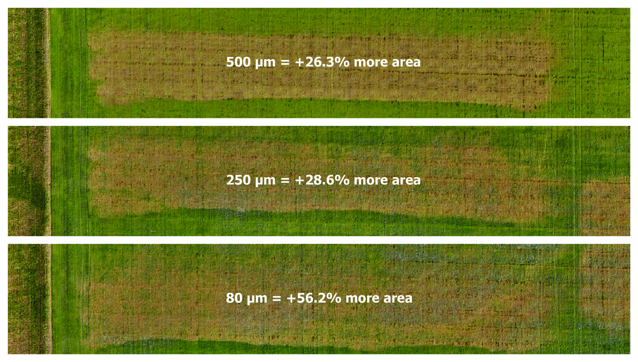 Maintaining these operational settings allowed us to make a more direct comparison of herbicide vs. fungicide placement and efficacy. All applications were performed using a 250 µm spray quality (Table 1).