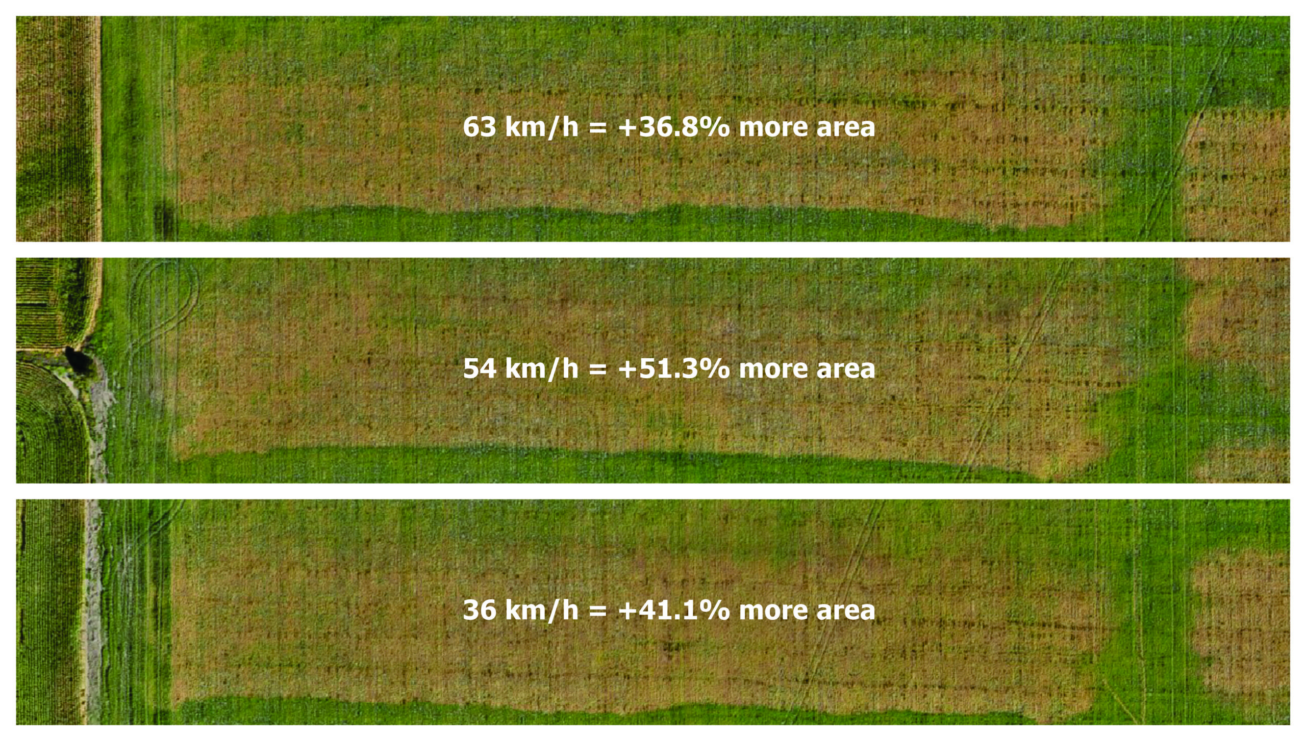 The intent of this part of the study was to explore the new drone design and its capabilities. Particularly, the impact of high-speed flight on swath width, displacement and drift. The DJI controller advises an altitude of 5 m or higher (likely a safety consideration). We felt this was too high for consistent coverage, and compromised by flying at 4 m (Table 2).
