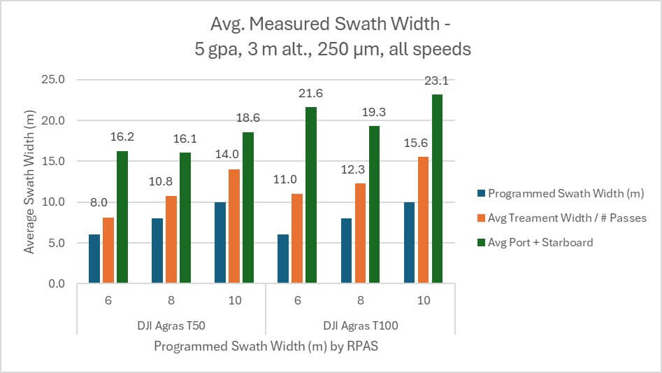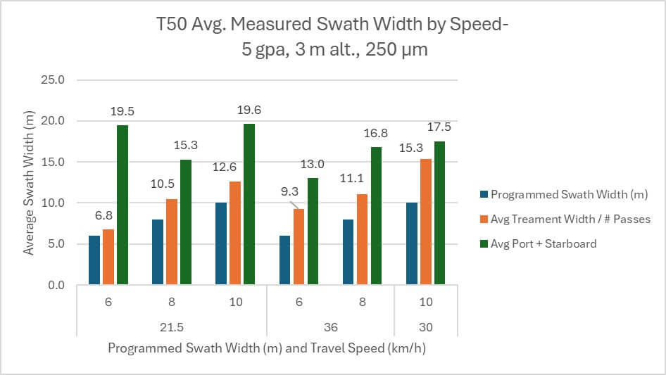 Figure 7 – Average measured swath width (two methods) compared to planned swath width for the T50 and T100 flown at 5 gpa, 3 m altitude, 250 µm spray quality and multiple speeds.