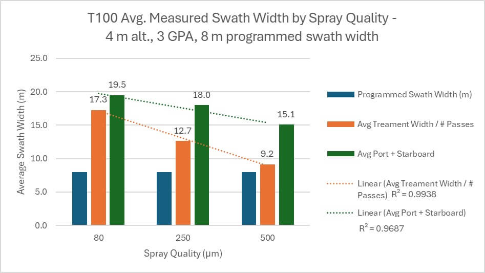 Swath widths from both calculation methods were negatively correlated with spray quality (Figure 13). Coarser droplets have greater mass, making them are less prone to displacement by wind than finer droplets. The “treatment width ÷ passes” saw an 80 μm spray quality produce a swath 46.8% larger than a 500 μm spray quality. The “port + starboard extent” method saw an 80 μm spray quality produce a swath 22.6% larger than a 500 μm spray quality.