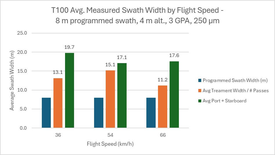 The relationship between flight speed and swath width was unclear. Employing the “port + starboard extent” method, the T50 produced shorter swaths at higher speeds, which is the reverse of what has been seen in previous swathing studies with the T10 and T50. Speed appeared to have no effect on the swaths produced by the T100. In this case, perhaps it’s capacity for higher speeds has allowed the T100 to pass beyond transitional lift into true flight, like a helicopter.